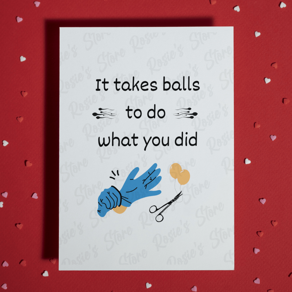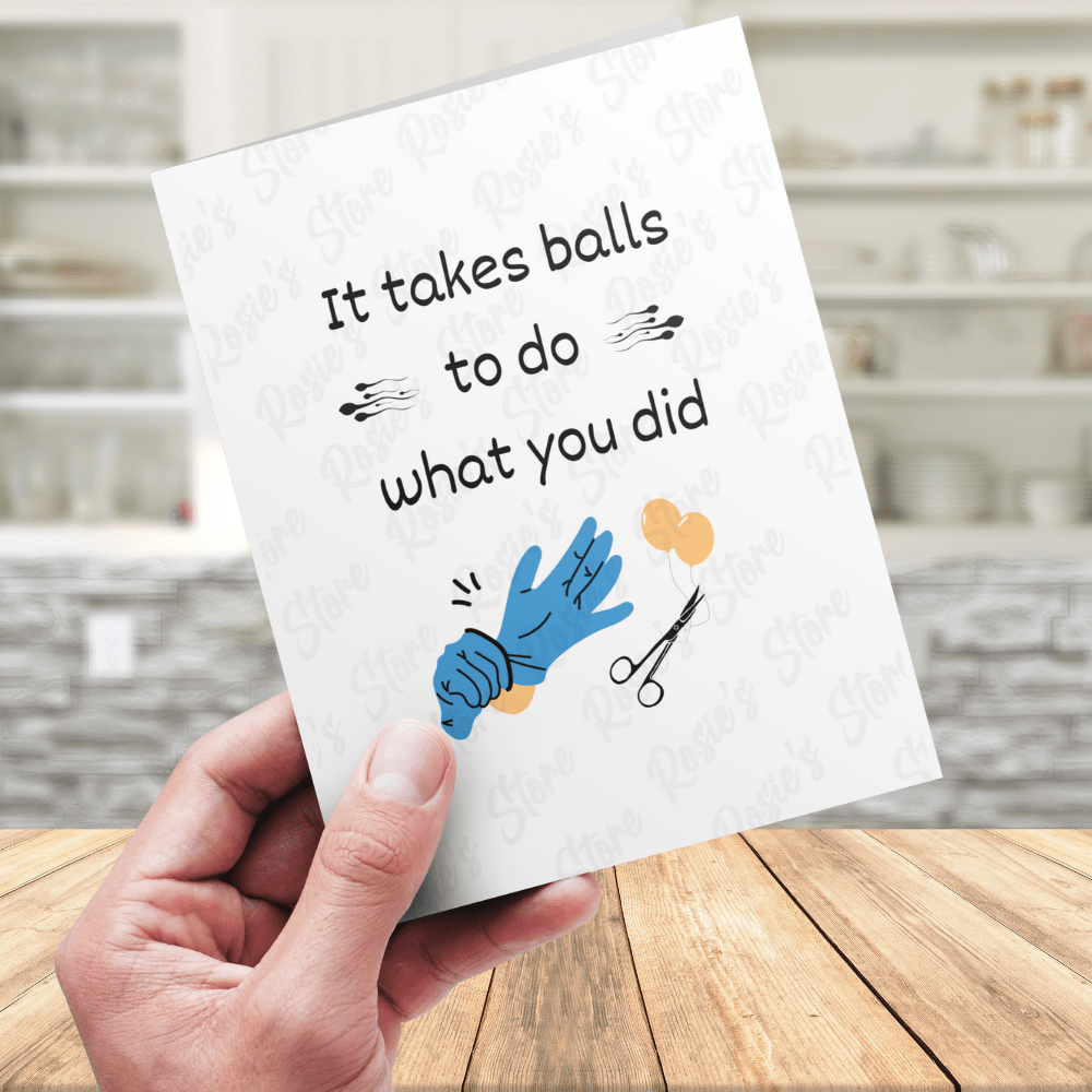 Celebrate the brave decision and ultimate dedication with our humorous and lighthearted vasectomy greeting card! Our "It takes balls to do what you did" card is perfect for expressing gratitude and a touch of playfulness to that special someone in your life who has taken the leap.