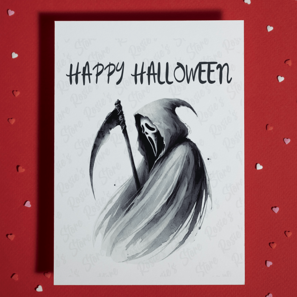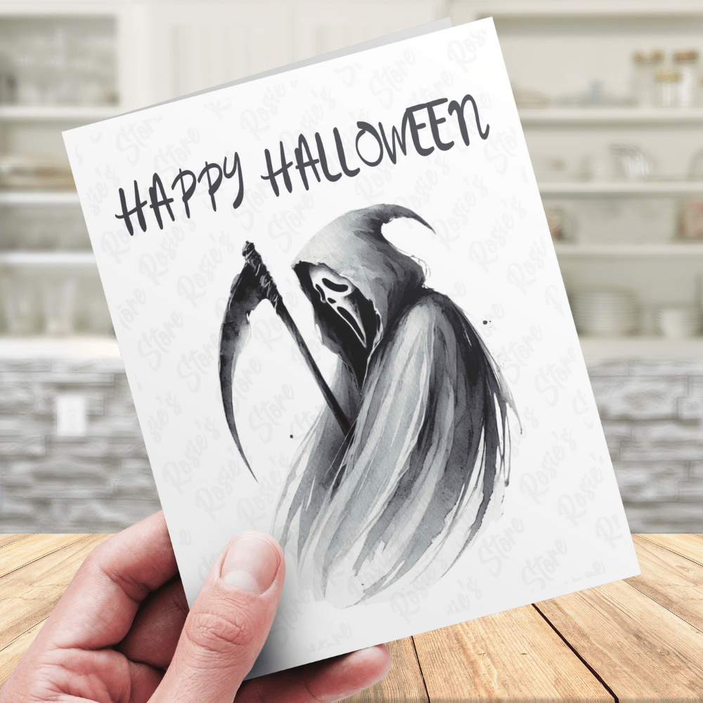 Keywords: personalized card, halloween, halloween card, halloween gift, ghost, reaper, spooky, halloween handmade, halloween party, haunted house, halloween cards, illustrated cards, greeting cards, watercolor cards, halloween party invitation.