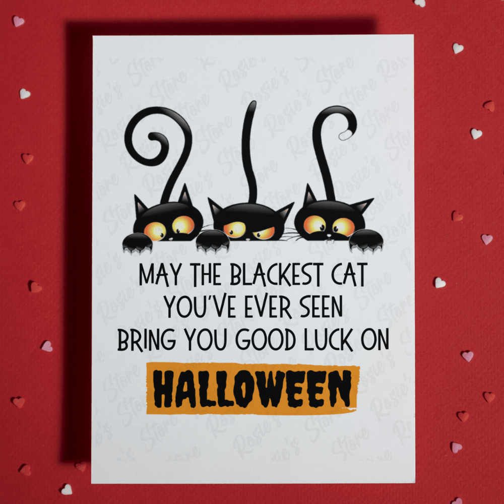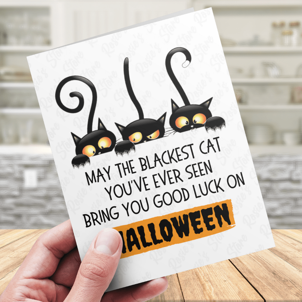 Introducing our charming "May the blackest cat you've ever seen bring you good luck on Halloween" greeting card, featuring a cute cartoon drawing of three playful black cats. This delightful card is perfect for sending Halloween wishes with a touch of whimsy. Measuring 4.25" x 5.5", it is crafted from high-quality, ACID-FREE, thick, and durable paper - proudly MADE IN USA! A white envelope is included with each card for added convenience.