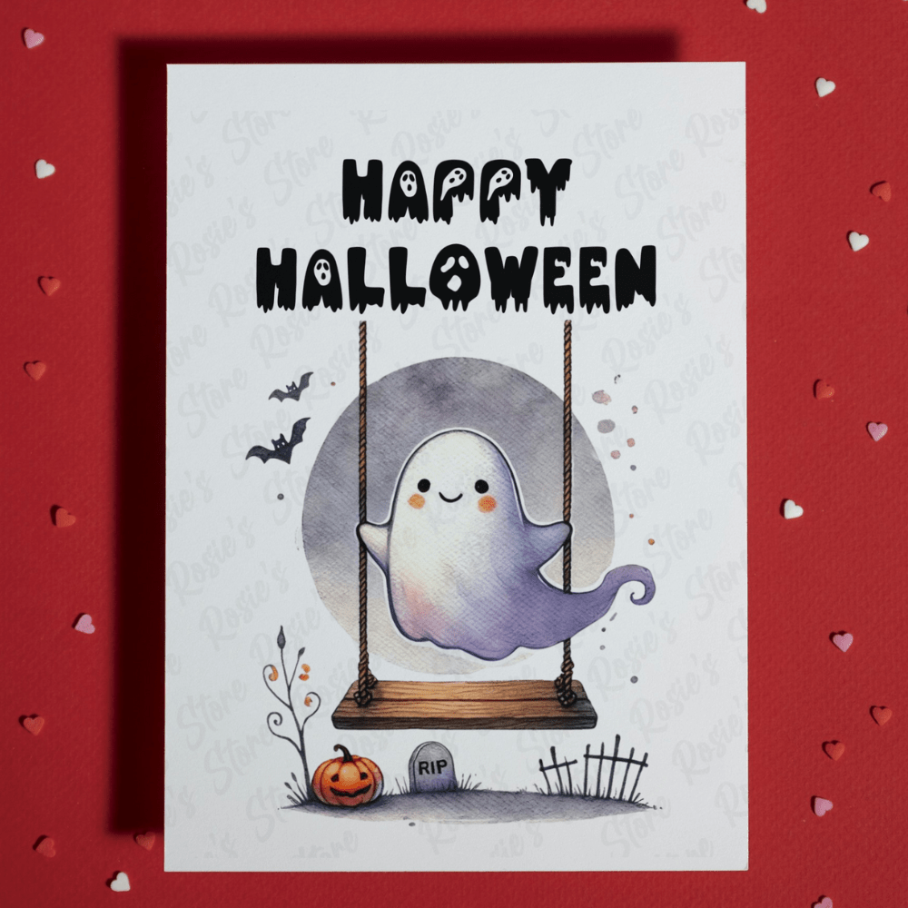 Keywords: personalized card, Halloween greeting cards, Halloween party invitation, Spooky season, Fall decor, cute ghost, illustrated cards, watercolor card, Happy Halloween.