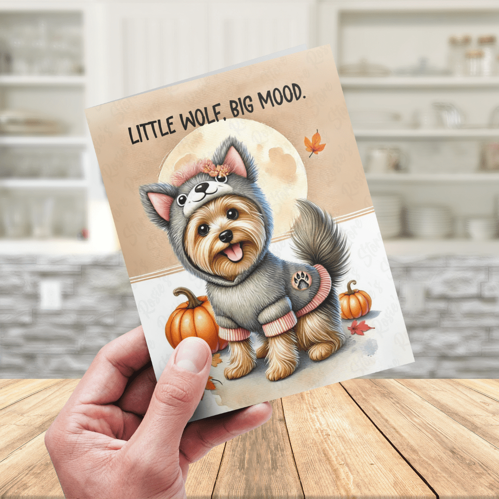 Halloween Fall Digital Greeting Card, Yorkie Dog Pet Lover: Little Wolf, Big Mood.