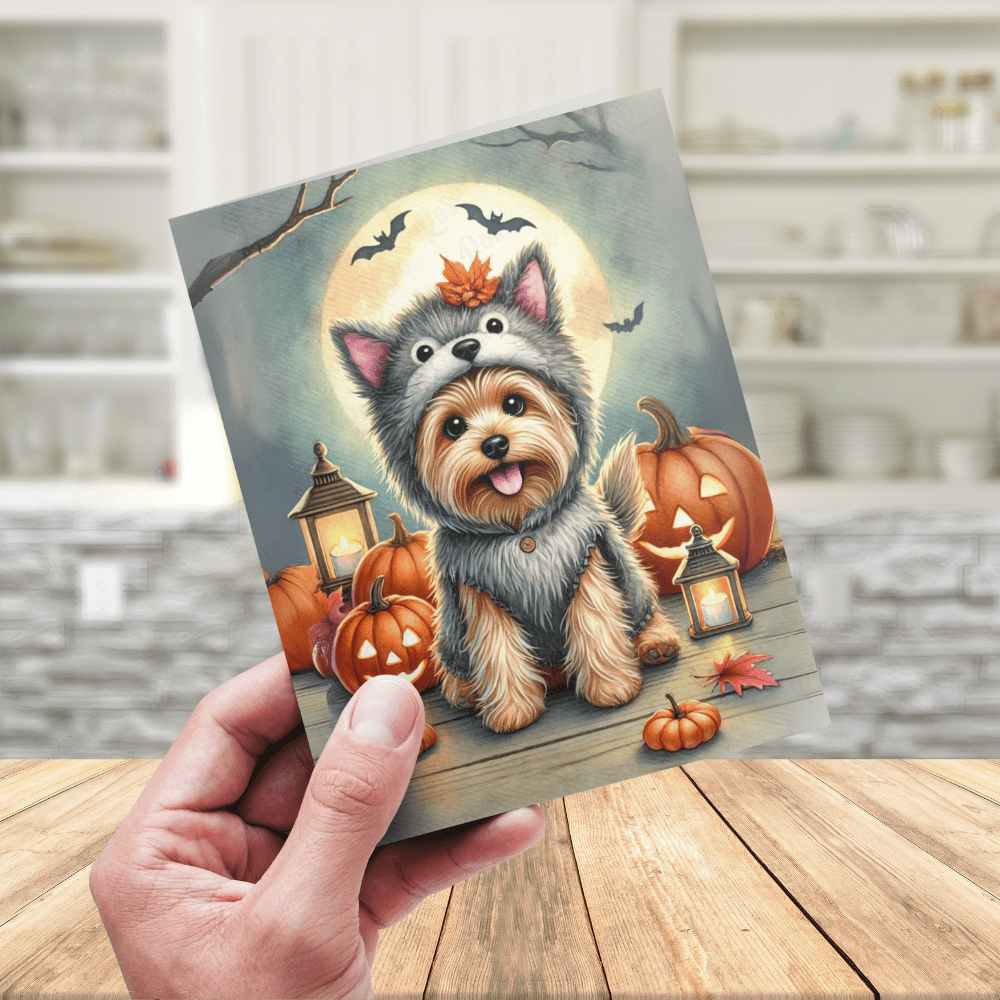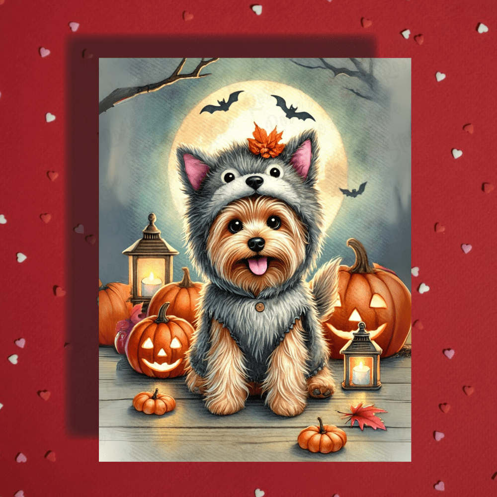 Bring on the Halloween magic with this beautifully illustrated fall card, featuring a cute Yorkie dressed in a fluffy wolf costume, sitting proudly among glowing jack-o'-lanterns and festive pumpkins. A glowing full moon and fluttering bats complete the spooky-fun scene, making this the perfect card for the spooky season!