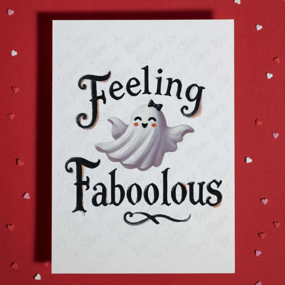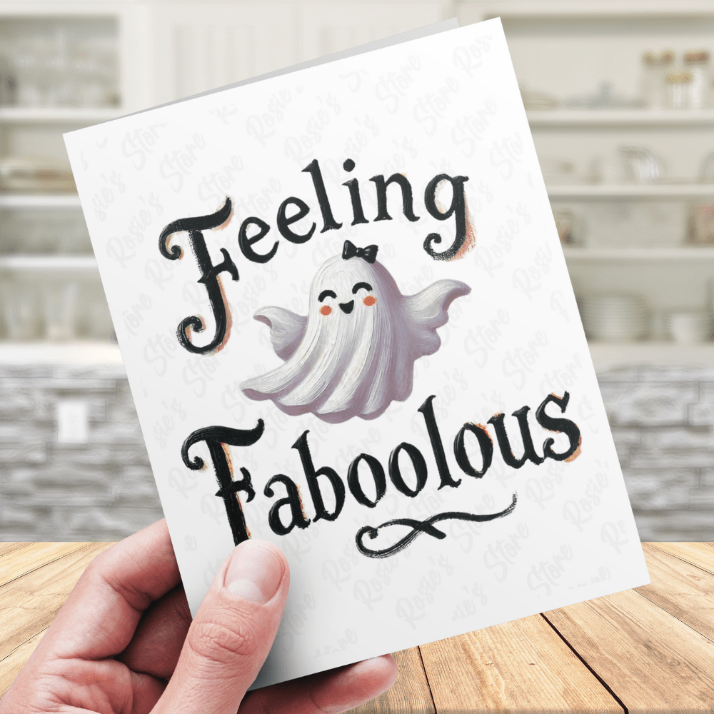 Introducing our "Feeling Faboolous" Halloween greeting card, featuring a cute cartoon oil painting of a fabulous ghost. This delightful card is perfect for adding a touch of fun and charm to your Halloween celebrations. Measuring 4.25" x 5.5", it is made from high-quality, ACID-FREE, thick, and durable paper - proudly MADE IN USA! A white envelope is included with each card for added convenience.