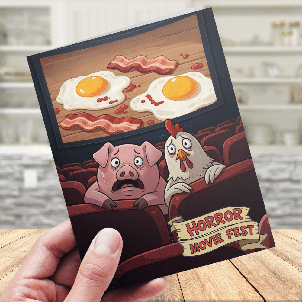 Looking for a unique greeting card that will truly stand out this spooky season? Our 4.25" x 5.5" Halloween card features a hilarious watercolor illustration of a pig and chicken absolutely freaking out while watching a horror movie – and on screen? Bacon and eggs, sunny side up! It's the perfect blend of spooky fun and dark humor, guaranteed to get a giggle.