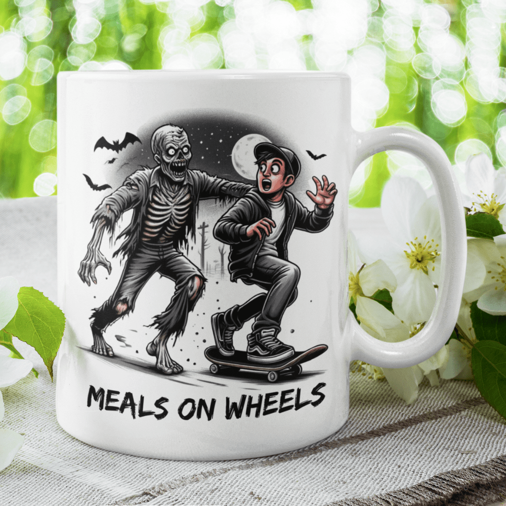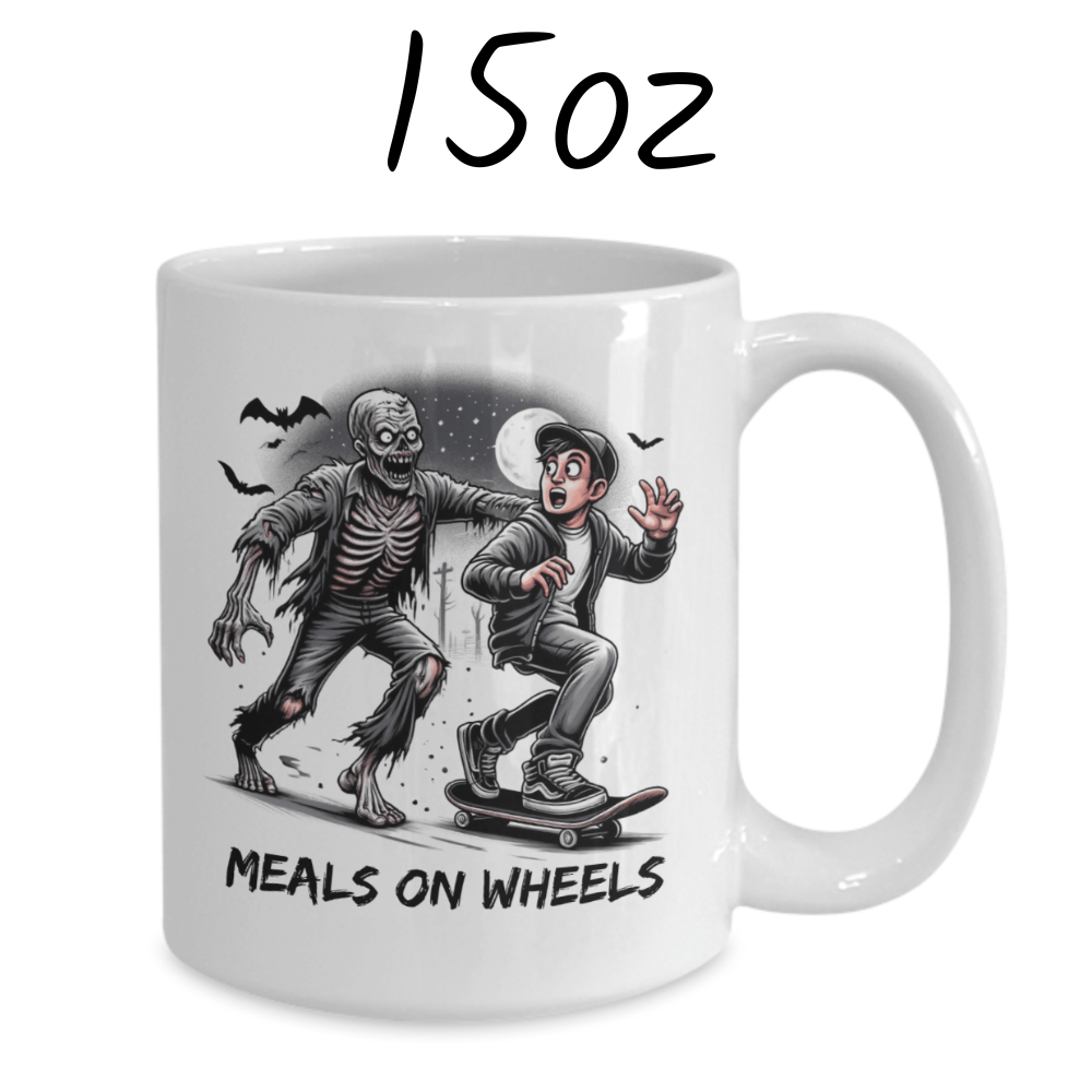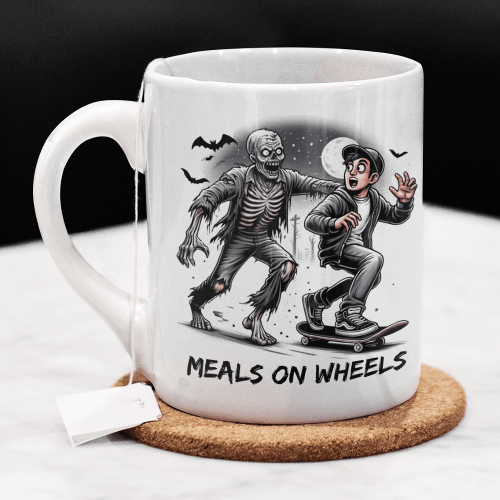 Inject some undead humor into your daily routine with our white ceramic coffee mug captioned "Meals on wheels" featuring a comical cartoon of a zombie chasing a man on a skateboard. This funny coffee mug cup is the perfect blend of horror and humor, ideal for those who love a good laugh with their scares.