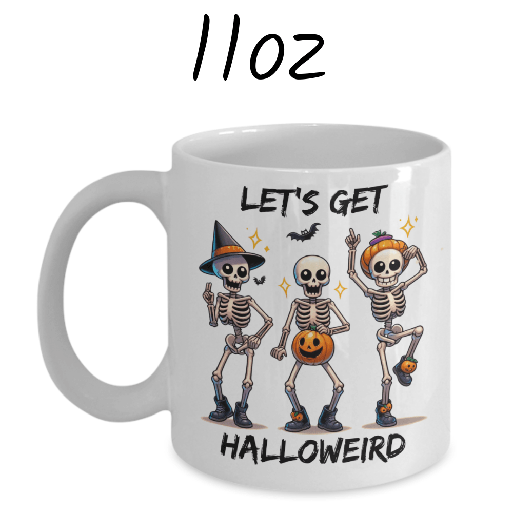 Embrace the quirky side of the spooky season with our "Let's get Halloweird" white ceramic coffee mug, featuring lively dancing skeletons that add a whimsical vibe to your Halloween festivities. This mug is perfect for those who love to celebrate Halloween with a sense of humor and fun.