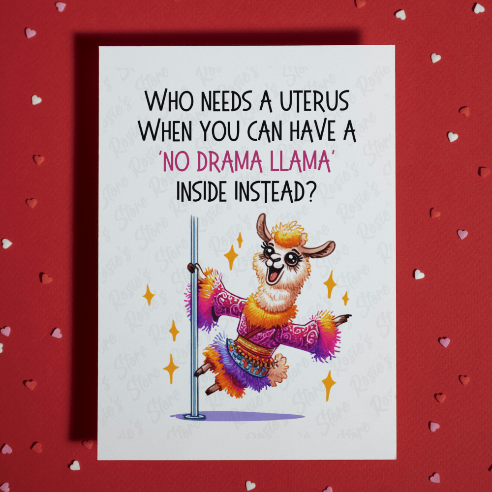 The front of the card reads "Who needs a uterus when you can have a 'no drama llama' inside instead?" While this may seem like a lighthearted joke, it can actually serve as a way to help alleviate some of the stress and anxiety that can come with undergoing this procedure.