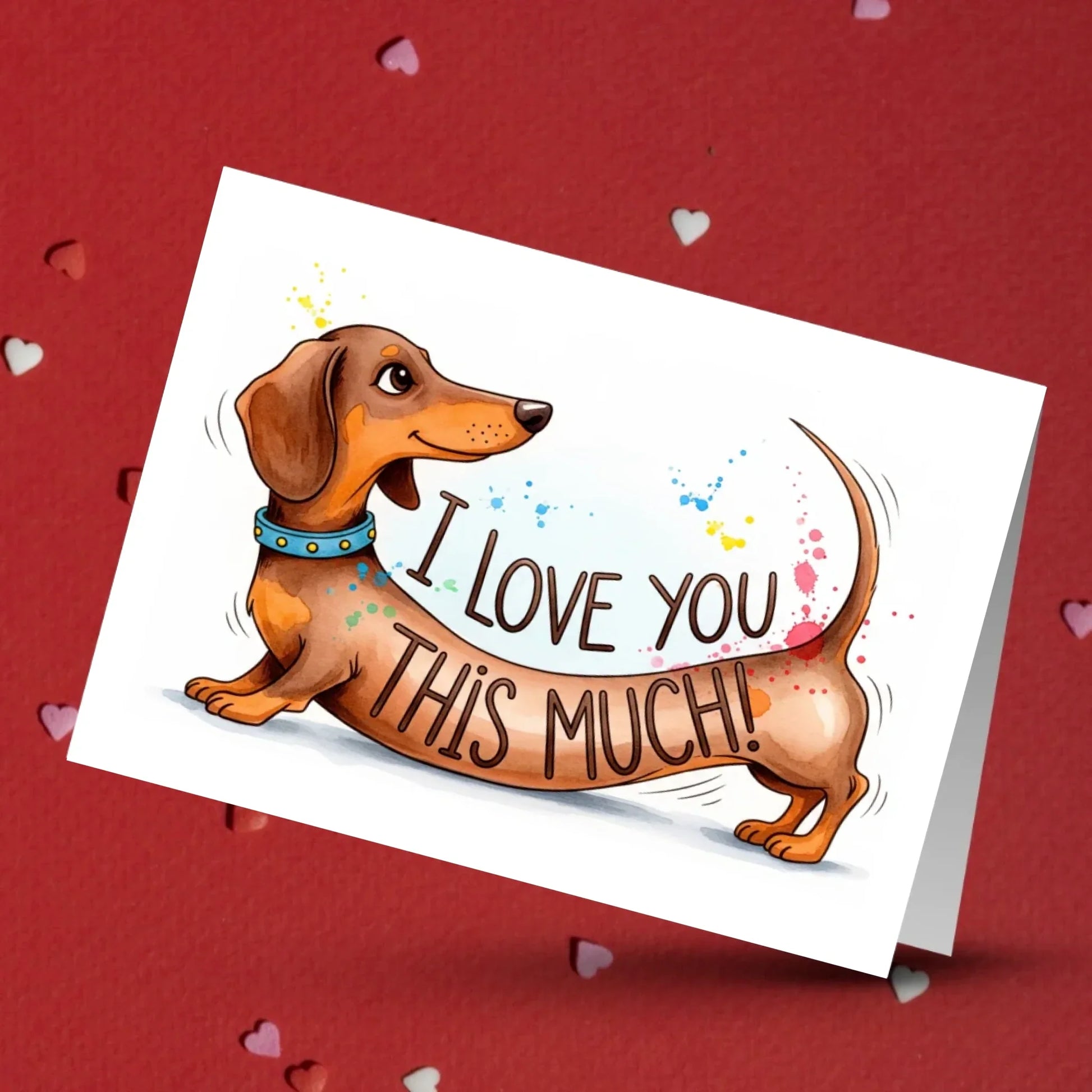 Show someone just how much you care with this adorable Dachshund greeting card featuring a charming watercolor illustration of a stretched-out sausage dog. The playful design perfectly expresses the message “I love you this much!”, making it a sweet and heartwarming card for someone special.