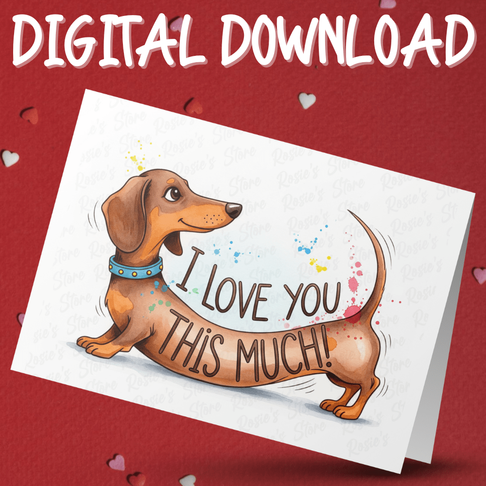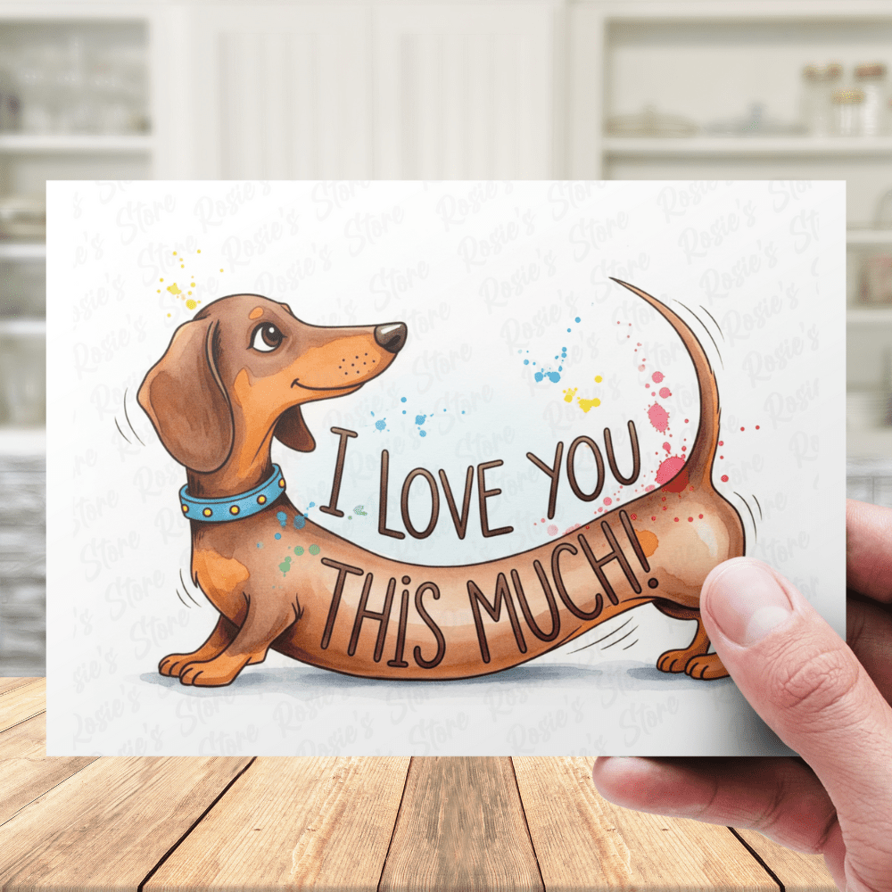 Express your boundless affection with our heartwarming "I Love You This Much" greeting card, featuring an adorable watercolor illustration of a stretched-out Dachshund dog! 💖🐶 This unique illustrated card is the perfect way to show just how much you care to any Dachshund dog pet lover, dog dad, or dog mom.