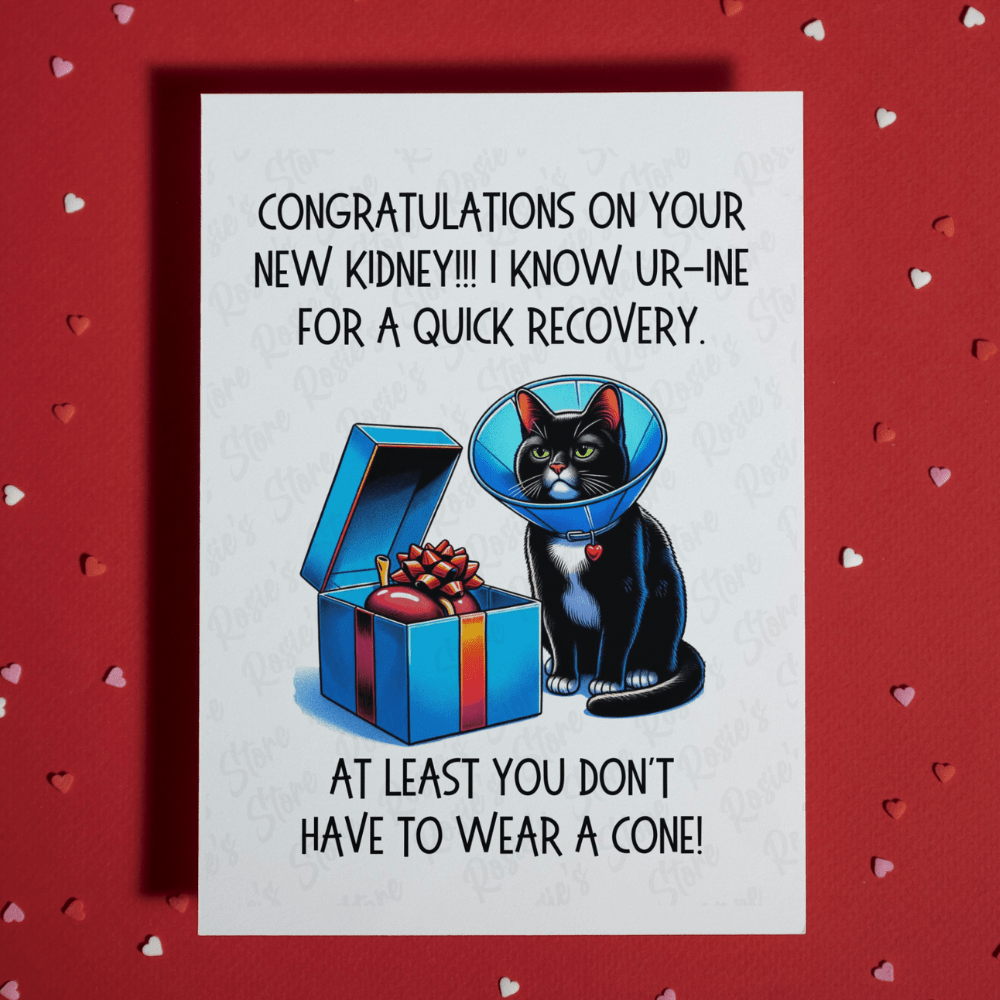 - Front Cover: Showcases an adorable cartoon drawing of a grumpy black cat wearing a medical cone, standing beside a gift box that humorously contains a new kidney. The playful message, "Congratulations on your new kidney. I know ur-ine for a quick recovery. At least you don't have to wear a cone!" is sure to elicit a chuckle.