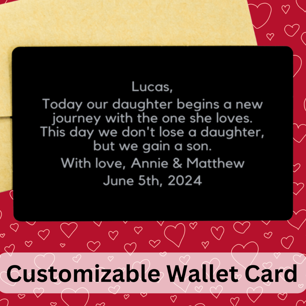 Introducing our personalized "Son-in-Law" Engraved Wallet Insert Card – a perfect keepsake for the special man joining your family. Celebrate your daughter’s new journey with the one she loves, and welcome a son into your family with this heartfelt message: "'Name' Today our daughter begins a new journey with the one she loves. This day we don't lose a daughter, but we gain a son. 'Your Text + Date'". Customize it with the son-in-law's name, your own text, and date for a truly unique gift.