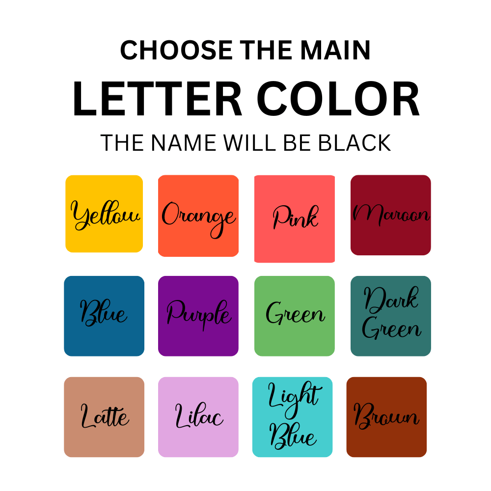 On the front side, customize with your chosen initial and name in any of our vibrant 12 colors!