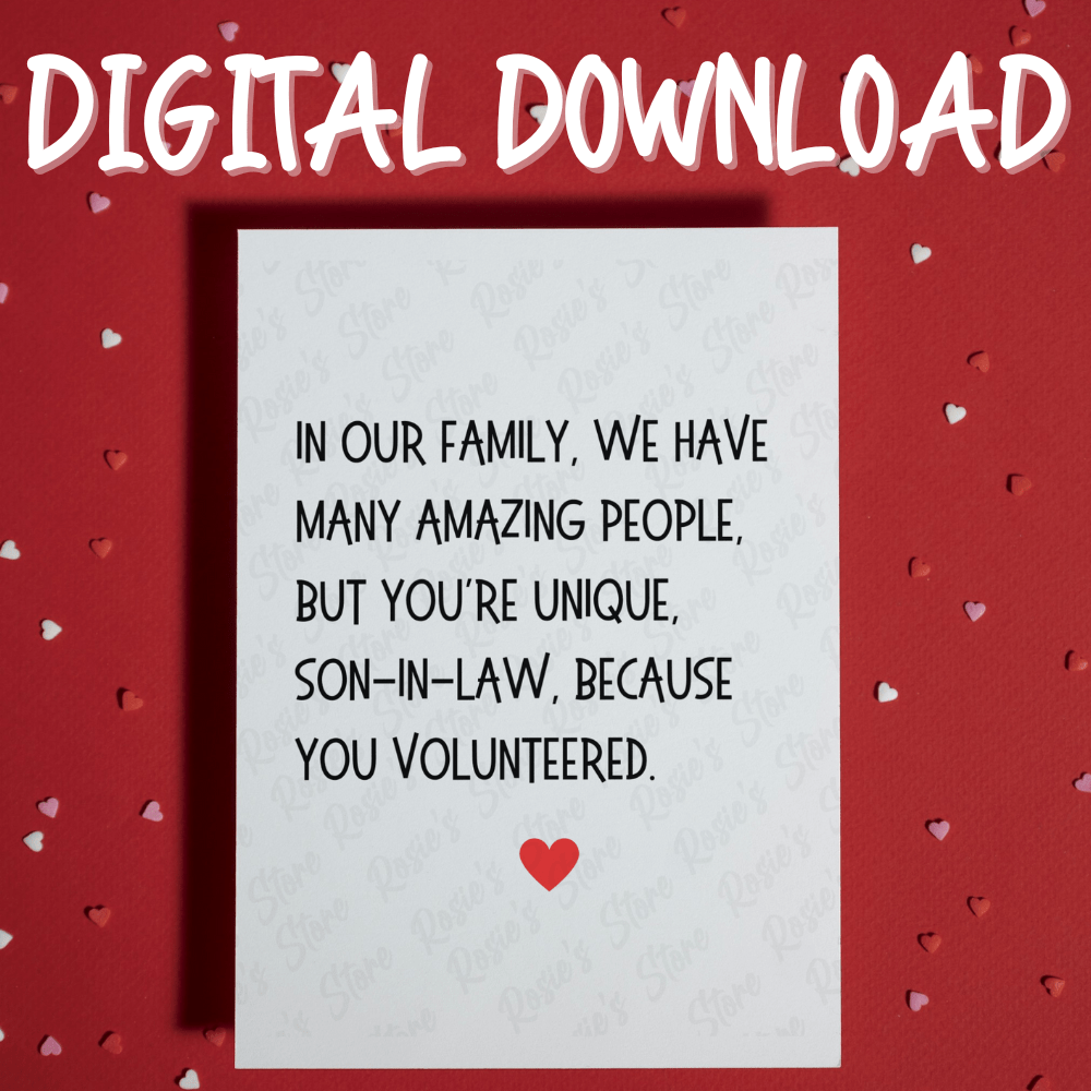 - Text on card: "In our family, we have many amazing people, but you're unique, Son-in-Law, because you volunteered."