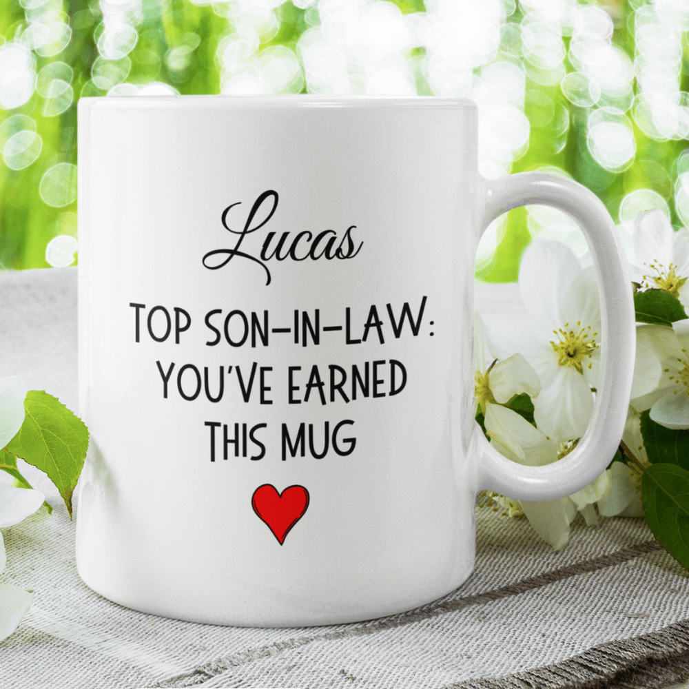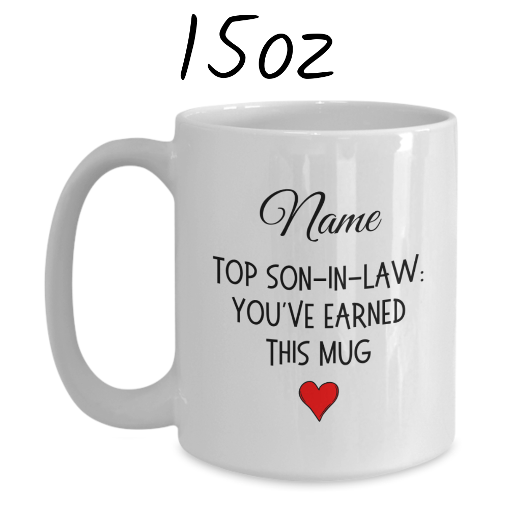 Celebrate your son-in-law in style with our personalized white ceramic coffee mug that proudly declares, "'[Name] Top Son-in-Law: You’ve Earned This Mug'". This custom mug is the perfect way to show appreciation for all that he does, making it an excellent gift for any occasion, from birthdays to holidays.