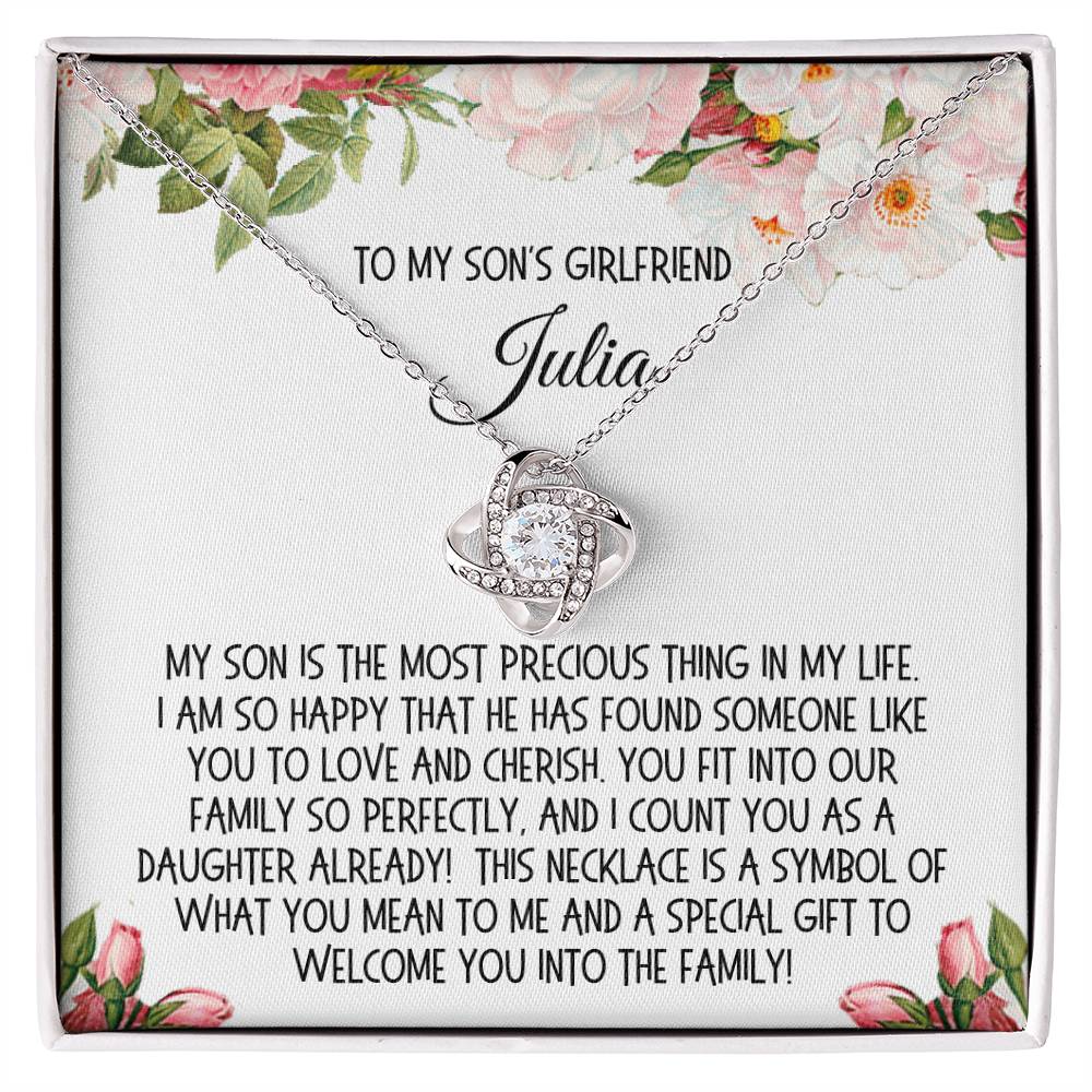 The accompanying message card, adorned with a beautiful cartoon drawing of flowers, carries a sincere message: "To my Son's Girlfriend, My son is the most precious thing in my life. I am so happy that he has found someone like you to love and cherish. You fit into our family so perfectly, and I count you as a daughter already! This necklace is a symbol of what you mean to me and a special gift to welcome you into the family!" Customize this heartfelt greeting by adding your son’s girlfriend's name, making it a uniquely personal gift.