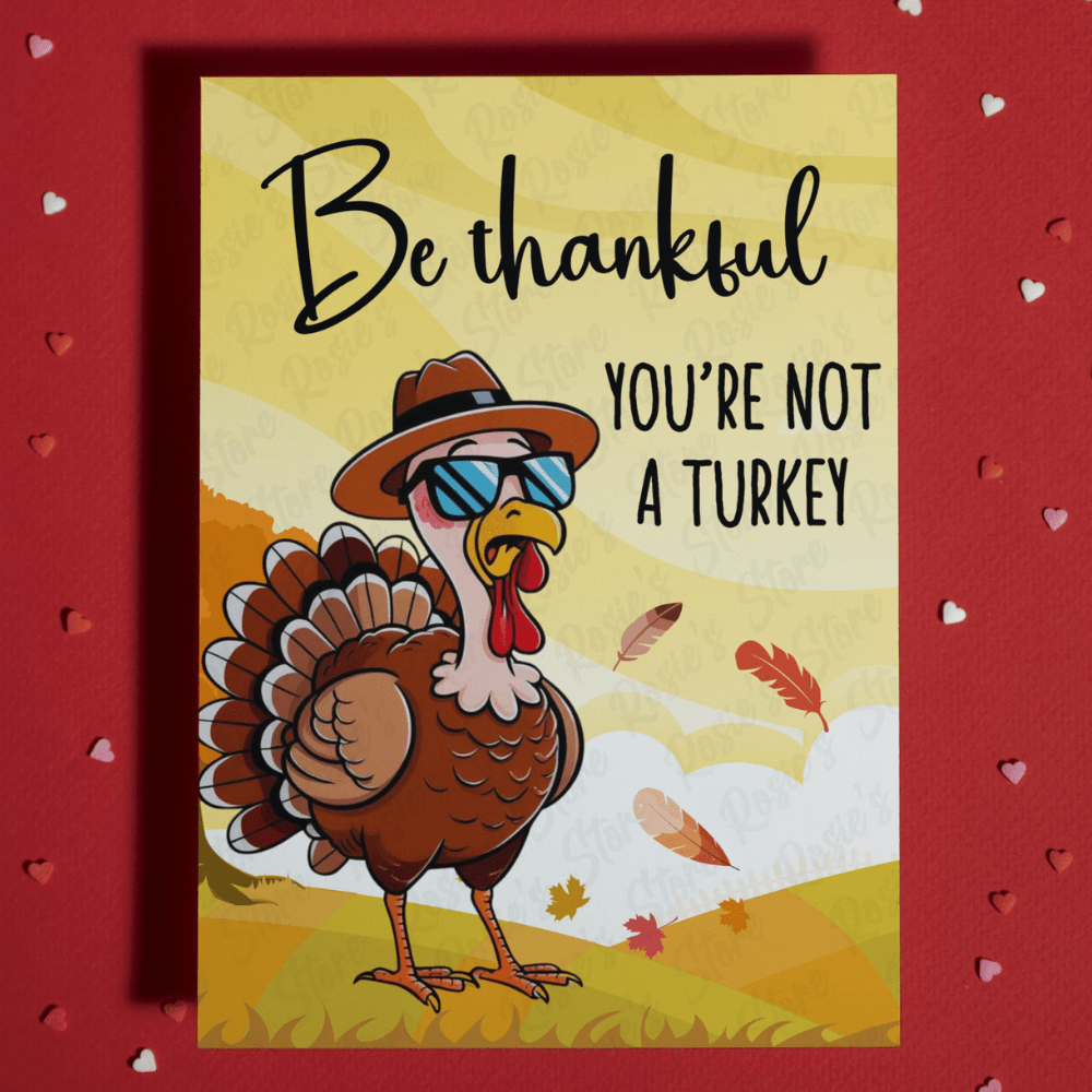 Introducing our humorous Thanksgiving greeting card: "Be thankful you're not a turkey," featuring a cartoon drawing of a turkey incognito, complete with a funny disguise to avoid the holiday spotlight! This card is perfect for adding a dash of humor to Thanksgiving and is sure to make everyone smile.