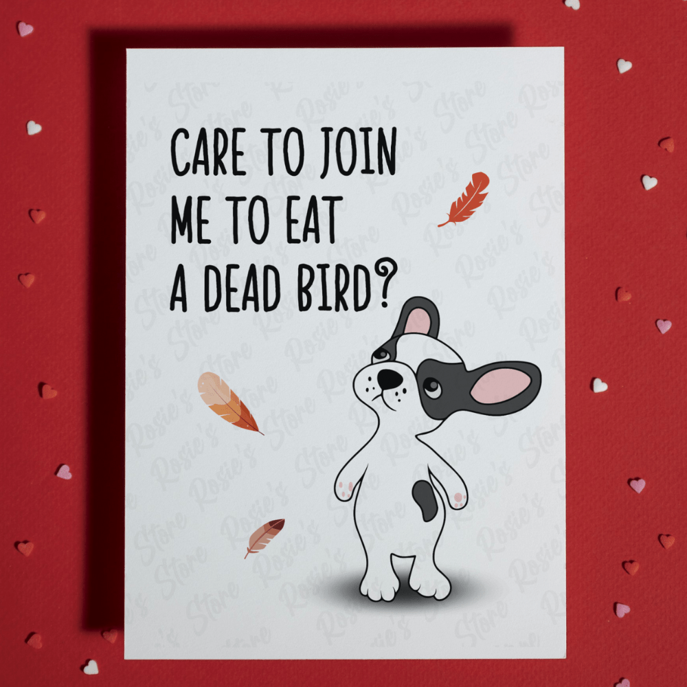 Introducing our playful Thanksgiving greeting card: "Care to join me to eat a dead bird?" featuring a curious cartoon dog surrounded by turkey feathers around the text. This lighthearted card is perfect for anyone with a sense of humor, especially dog lovers, and brings a fun twist to the Thanksgiving tradition!