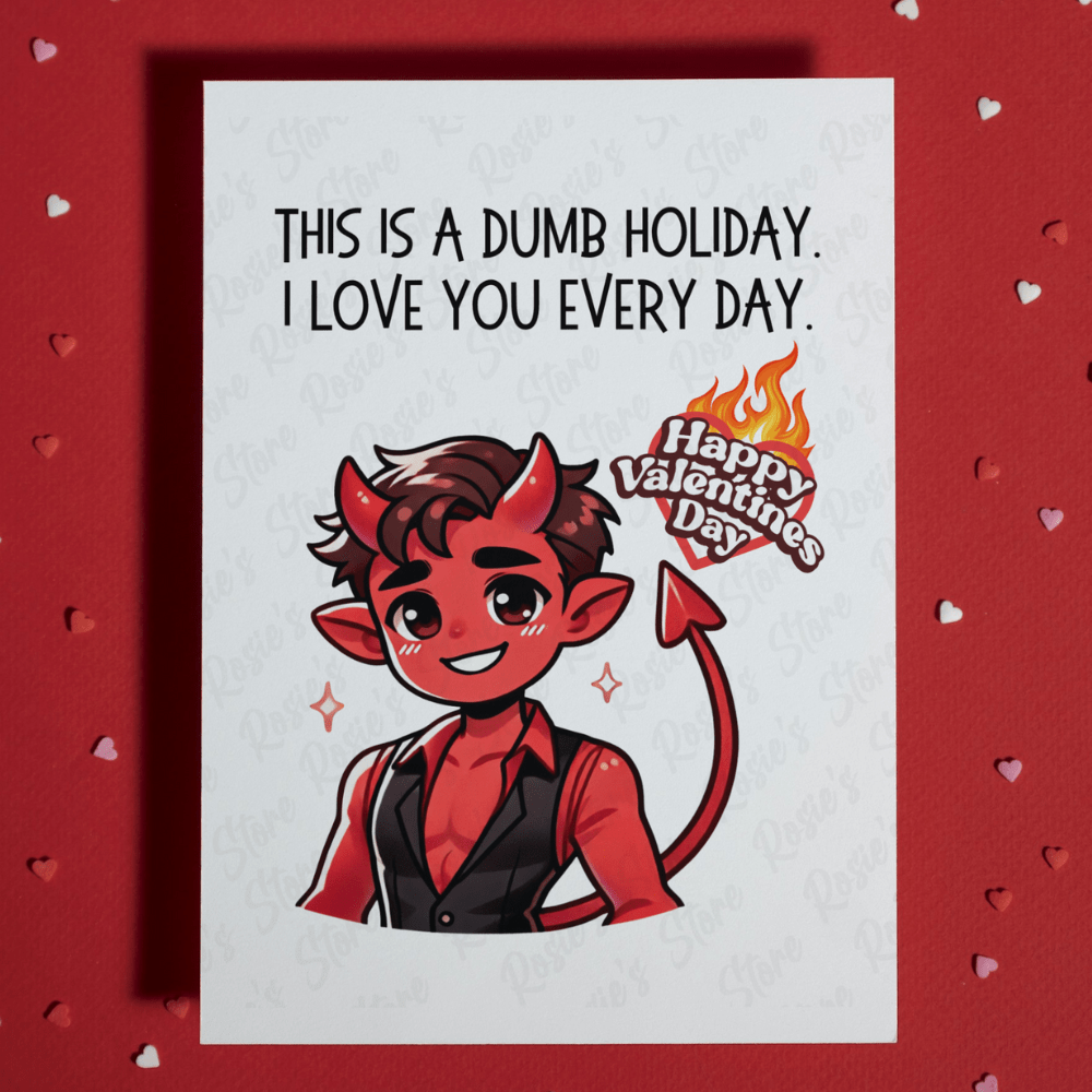 Introducing our playful and untraditional Valentine's Day greeting card: "This is a dumb holiday. I love you every day. Happy Valentine's Day," featuring a charming cartoon drawing of a cute devil woman. This unique card is perfect for expressing your love with humor and a touch of mischief!